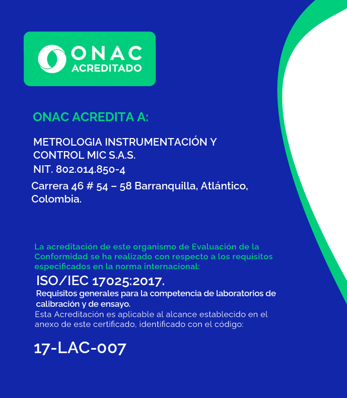 METROLOGÍA INSTRUMENTACIÓN Y CONTROL MIC SAS, es una empresa con más de 22 años en el mercado local, nacional e internacional, dedicada a los procesos de calibración de equipos e instrumentos de los sectores industriales, comerciales, servicios y de la salud; enfocados en el desarrollo de nuestro portafolio de productos que logra cubrir las necesidades del mercado, brindando un servicio basado en calidad y confiabilidad, para lo cual contamos con certificación de procesos en calidad y un grupo de colaboradores competentes y comprometidos con los criterios de la imagen organizacional, que trabajan en el logro de resultados efectivos para los socios, colaboradores, clientes, proveedores y comunidad en general.